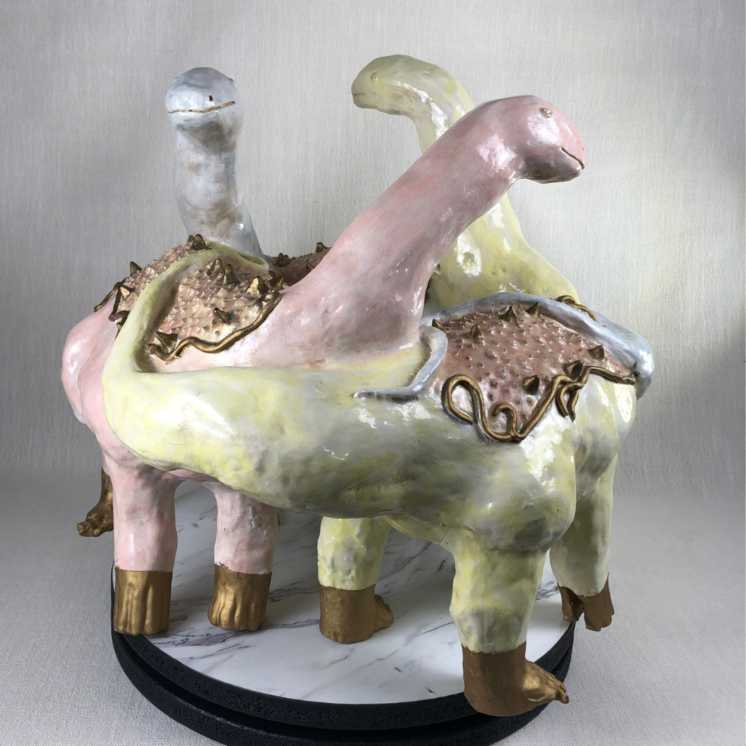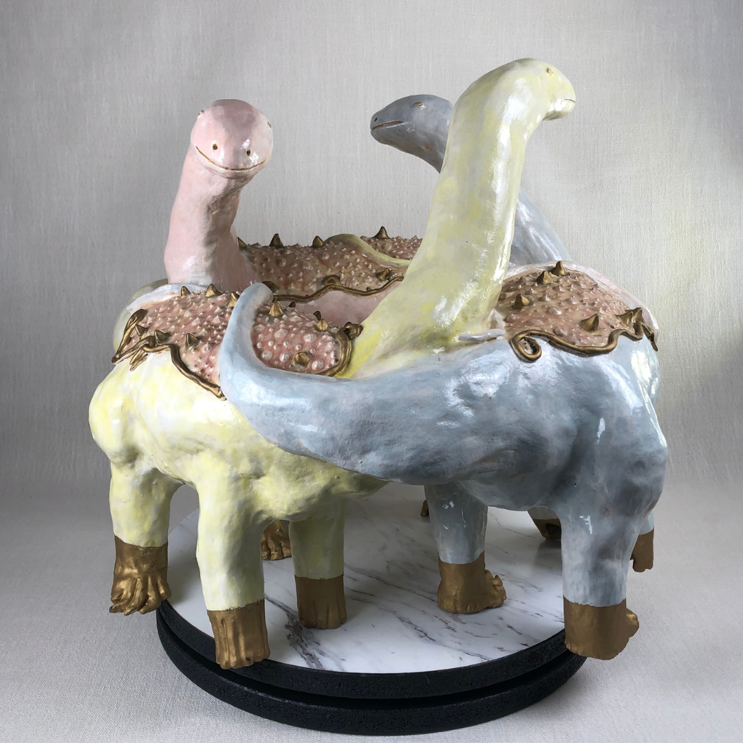 Dinosaurs are endlessly fascinating to me. I’ve got a soft-spot for the clunky, giant-lizard style dinosaurs as envisioned by illustrators and scientists in the heady days of the first discoveries. I’ve always loved the long-necks, and when challenged to create an animal sculpture that also incorporated design elements from the Rococo period, this is what popped out.